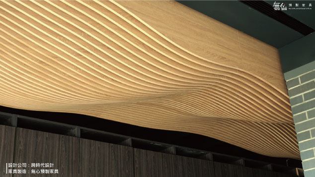 從一進門的入口接待處就能看到壯觀極具吸睛、自然的曲線如同潮水一般有強烈的生命力造型浪板,就是無心透過數位軟體以微距的曲線編排出3D立體的弧形曲面,彷彿波瀾一般立在接待處的上方,透過先進的精密機器技術,軟體配合硬體設備精準的裁切板材,成功完美地將設計師的設計理念復刻到現實,為室內設計完美打型!除了這可觀的浪板,餐廳的座位規劃採隔柵式空間及獨立包廂空間,你能想像用預製家具也能做出格柵的效果嗎~沒錯!無心預製家具做到了!運用數位化的技術,編排出隔柵的對應位置,並對板材進行洗孔,就像卯栓一樣固定住,同時透過軟體編排的方式,將板材的使用率極大化,幫助設計師節省板料上的成本、減少裝修後殘留的廢棄物同時響應環保不浪費。